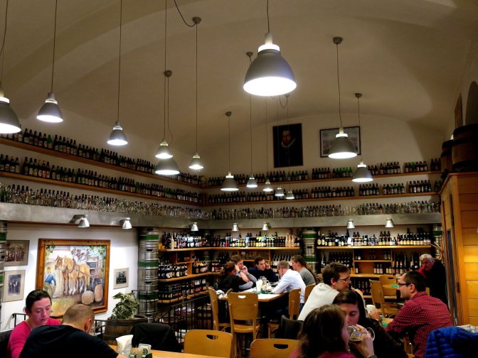 Located in the Karlin neighborhood which is a 10-15 minute walk from the Old City, Pivovarsky Klub is an Untappd apostle’s delight. The website claims 240 different beers in the bottle and 6 on tap. Looking around at the bottles lining the walls, it is enough to give a beer pilgrim brain freeze. Don’t expect haut cuisine though.