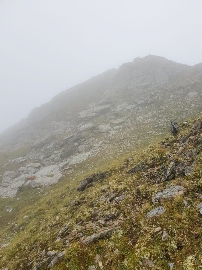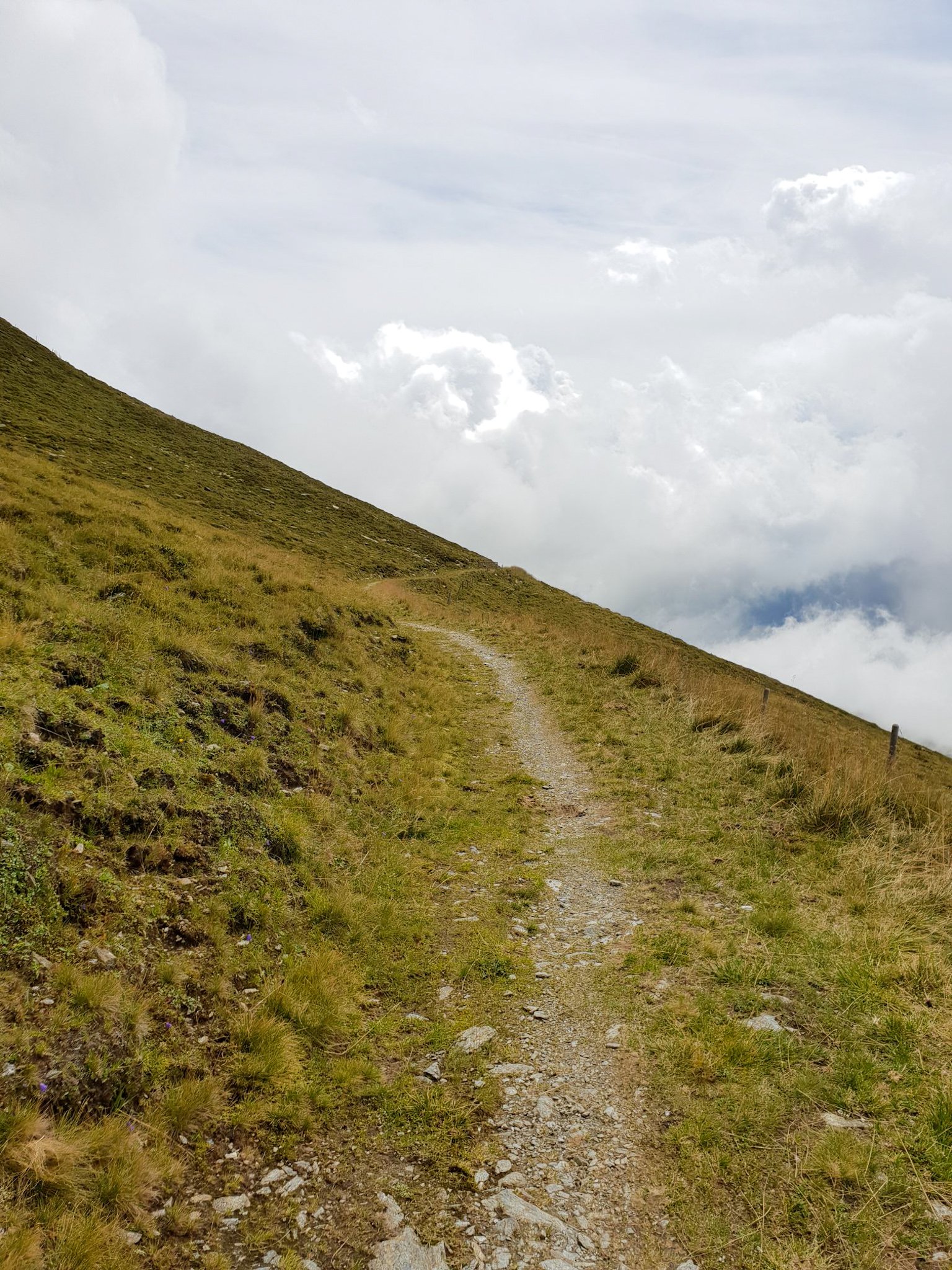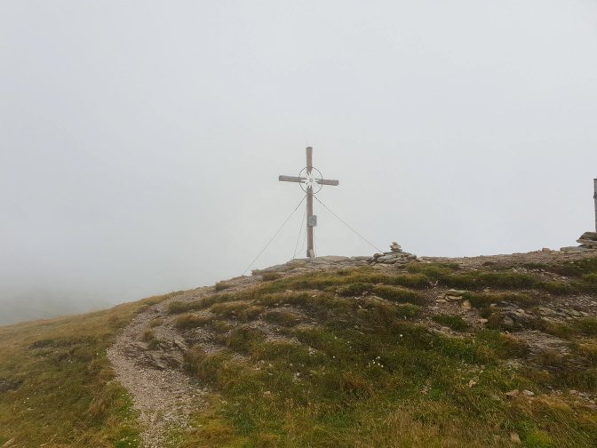 Rastkogel was not the only unplanned segment of the week. When I reached the Wangelspitze in the blanket of clouds on Monday, I was totally prepared for the reality that this would be the accomplishment of the hike. The route was now heading down a different way which would ultimately loop me back to the Penkenjoch plateau. However, I was intrigued by what appeared to be a peak behind the Wanglespitze. There was no trail on my trail map, yet it appeared to be a completely safe and doable ascent. There was no designed trail on the ground either but I could tell that I was not the first one with the idea. The ascent was safe enough that a trail was not necessary. At the top of this small peak stood a weather tower with a trail down on the opposite side of this peak. I have looked unsuccessfully on a few different maps for a name. But reaching it gave me an unplanned bonus to a hike marred by a slight bad luck in weather.