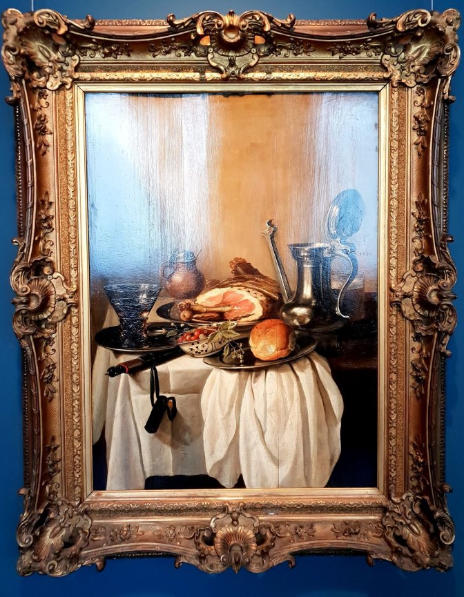 Pieter Claesz was a master at painting flagons. From first glance, the flagon along with a tasty-looking ham dominates his Banketje or Small Banquet. It may be small, but you can put a lot of wine in that flagon. Is there an allegory to the lid being open? The glass just behind the flagon looks like a modern whisky tumbler, a deceptively large one. It is the least elegant object in the scene and is clearly full of something. White wine? There is a Berkemeyer glass on the left of the image which would normally be the drinking glass of choice, but this appears empty. Wine is always drunk from stemmed glasses, isn’t it? These vanitas paintings are always a collection of objects in disarray. They are also almost always allegorical. It is possible the open flagon and the mysteriously hidden glass, possibly full of wine, represents hypocrisy. The person has filled a big glass with wine and hidden it but is trying to show the viewer with the open flagon and empty Berkemeyer that they don’t consume alcohol foolishly. However, I prefer to think the hidden glass is something else and the person with this chaotic spread is simply choosing to drink right from the flagon rather than bother with the Berkemeyer. The best part of the flagon is not the open lid, but what appears to be the reflection of a curtained window which is the main light source for the scene. Claesz, by the way, was born in Berchem, Belgium, a suburb of Antwerpen. He is one of many Flemish painters that migrated to the Netherlands in the early 1600’s during the religious wars. Claesz coincidentally (or not) ended up in Haarlem, the same place as my favorite painter, Frans Hals (also born in Antwerpen).
