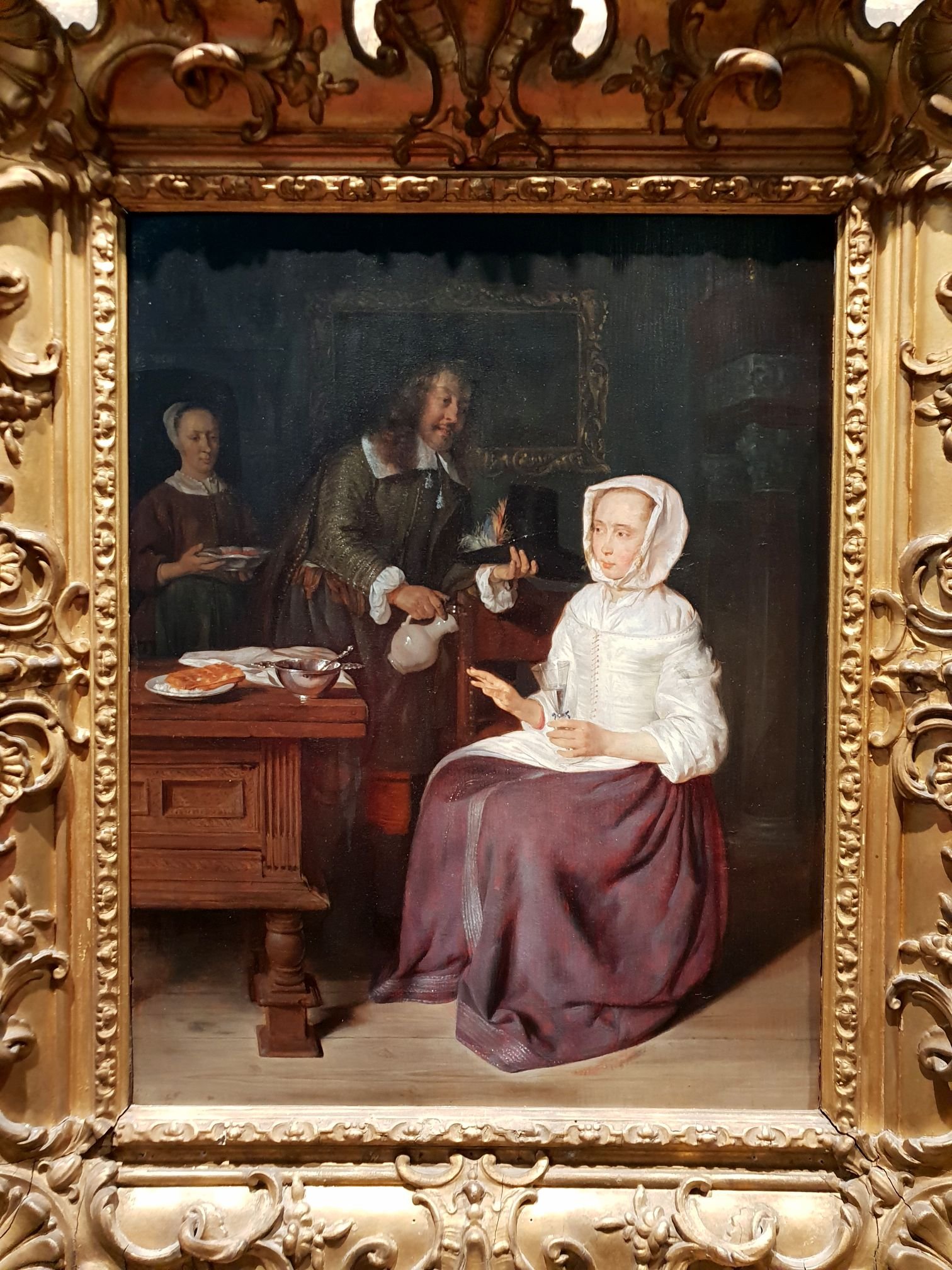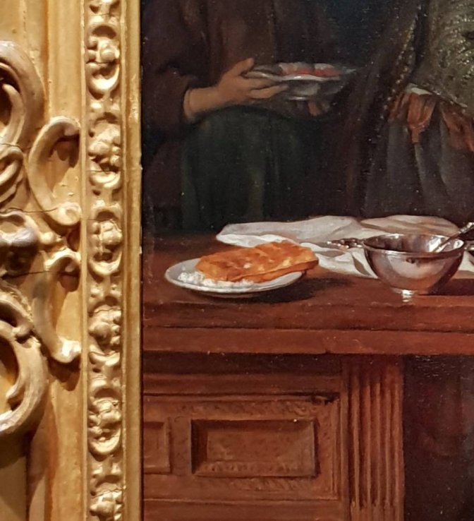 There is so much about this next painting that I love. Here we have Gabriรซl Metsu’s Galant Gezelschap or Courteous Company. No date, but Metsu lived from 1629-1667. Like the Traveller in the previous painting, the woman in the foreground, with the humble but rich-looking white and burgundy dress, is a guest in someone’s home. She is holding neither a Berkemeyer nor beaker glass, but a fluted type of wine glass looking like an ancestor of today’s champagne glasses. The master of the house is offering her more to drink from a ceramic flask with a metallic lid. The gesture of the woman is one of Hey, slow down, Mister. Her angelic gaze framed by a pious head covering is not directed at the man, but right thru him, perhaps towards the lady of the house who is bringing in some food. You can just imagine the munchies coming on as she is feeling the buzz from drinking the first half of her glass. The look of the man is one of amusement as if pleased with himself for getting the dainty-looking guest drunk. The way he holds his hat with the pinky finger in a prone position is just one of the many impressive details about this painting. But nothing tops the object on the left center of the scene. If you thought the Belgian waffle with powdered sugar was a modern touristy tradition, think again.