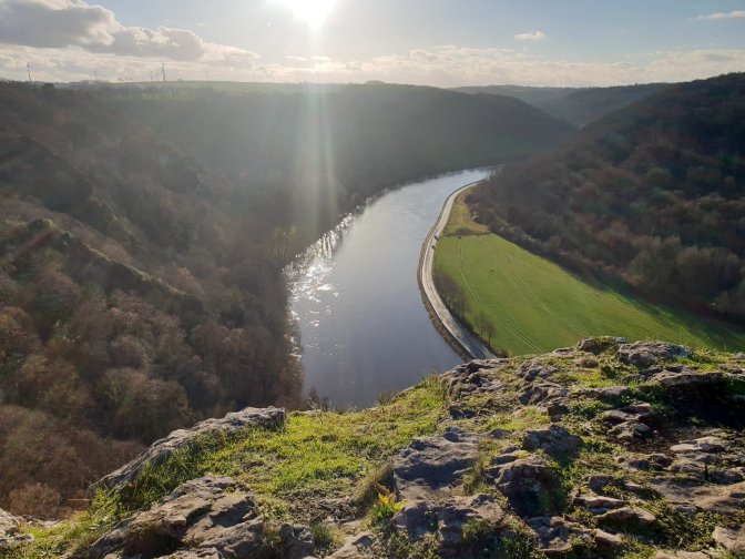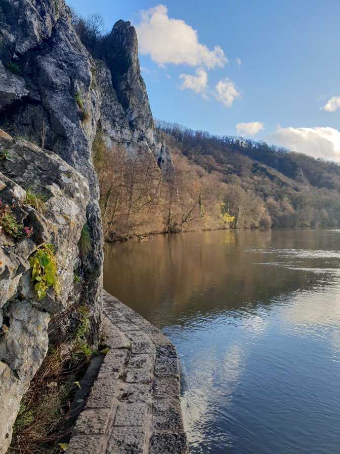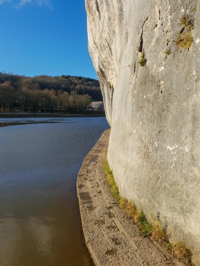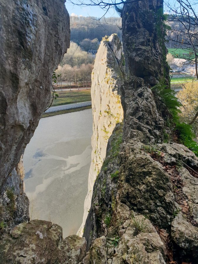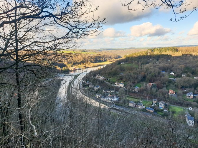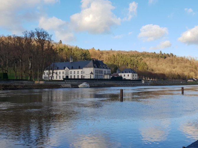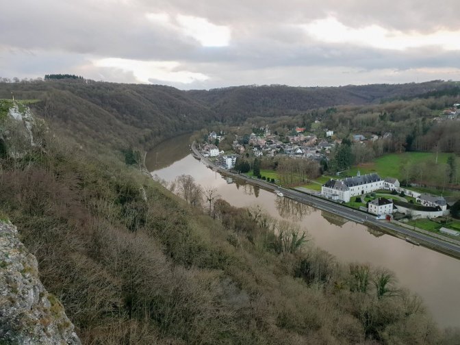 This highroad would make up a small part of the hike giving wonderful views overlooking the Chรขteau Freyr and the village of Waulsort with it’s Chรขteau de Waulsort, formerly a Benedictine Abbey. This hike has an amazing variety of scenery, from proud majestic farmland, to the dark luxuriant foliage mentioned by Edwards, to a promenade along the Meuse giving glimpses at bygone hotels and vast lush green valleys, and to the famous craggy limestone cliffs from many perspectives.