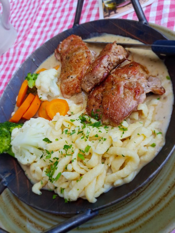 The sizzling plate of my beloved spaetzle with a side of vegetables and seared pork cutlets finally arrived at my table. The eight-and-a-half hour drive had left my tastebuds well-prepared for the salty Bavarian cooking, and the first bite of the succulent pork brought a wave of umami-esque chills throughout my nervous system. I sipped the Wieninger beer, delighting in that crisp goldeness that is German pilsner, although mildly disappointed that a traditional restaurant with a name like Brenner Bräu didn’t have their own beer.