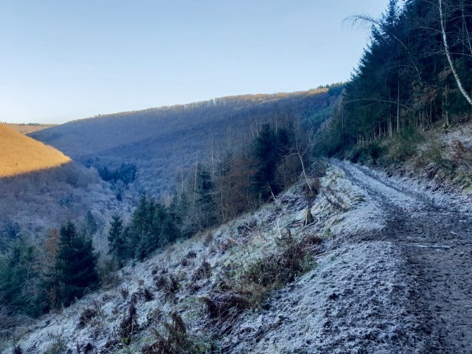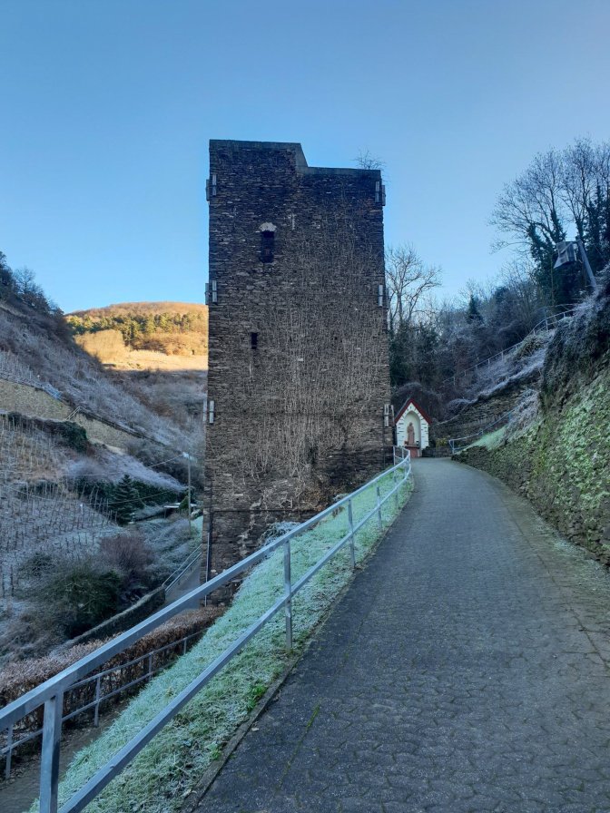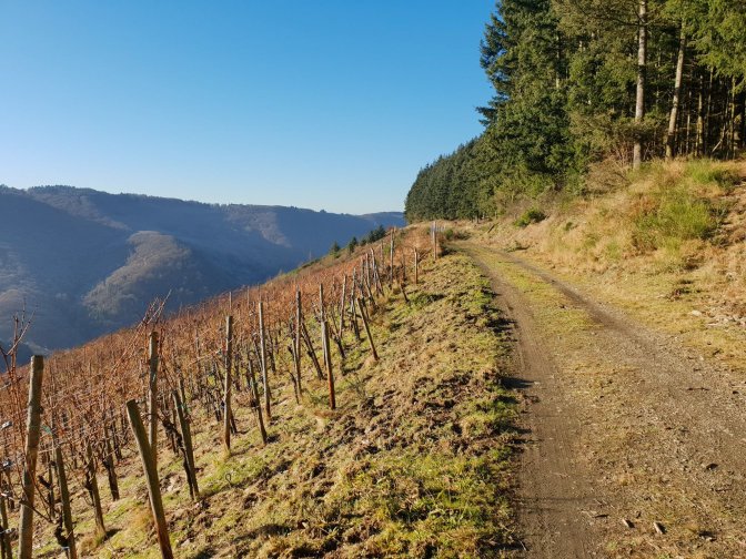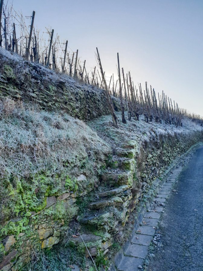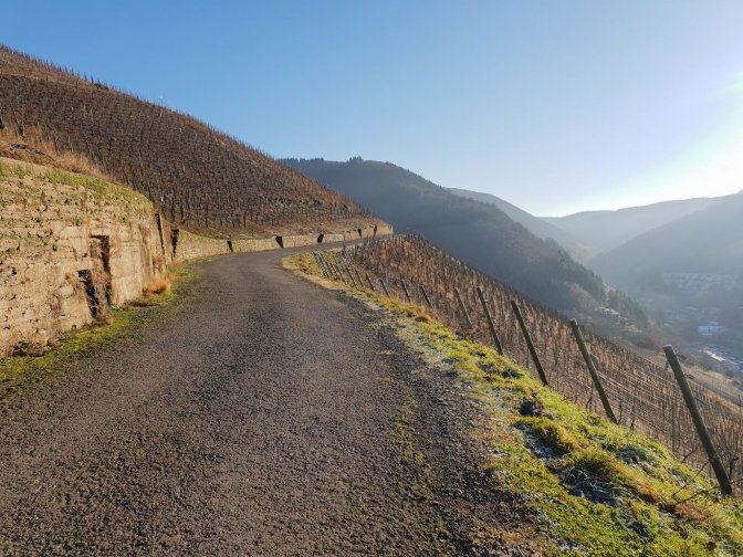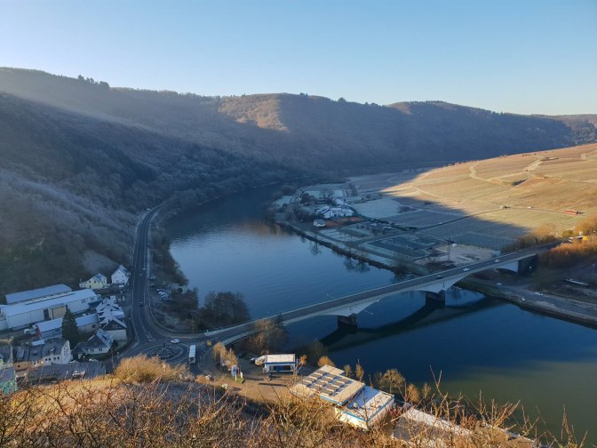 Behind Zell, the vineyards of the Zeller Schwarze Katz ascend steeply, defying gravity and making one admire the skill it must take to maintain and harvest them. Roads and paths weave thru the vineyards making a great addition to a hiking route. In December though, grapevines are nothing more than brown sticks in the ground. But thanks to a particularly sunny day, you could almost imagine a sea of green.