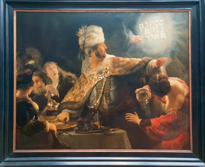 When a criminal empire throws a drinking party, they must in some way give the middle finger to their enemy. There is no better example of this than Babylonian King Belshazzar throwing a party with wine served in chalices stolen from the Jerusalem Temple. In Belshazzar’s Feast, Rembrandt gives us arguably art’s most memorable profile as Belshazzar looks in shock at the words mene mene tekel upharsin appearing out of thin air. In very loose terms, it meant Belshazzar went messing with the wrong rival. He died that night.