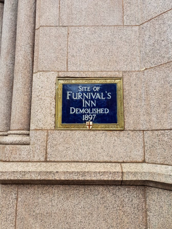 “The large red brick insurance building opposite Staple Inn on the north side of Holborn is on the site of Furnival’s, one of the original ten Inns of Chancery, where Dickens lived when he was first married and where he began the writing of “Pickwick Papers.”