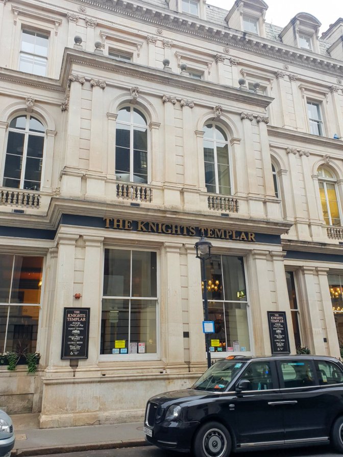 Thoroughly immersed now in the legal culture of Old London, I was again suffering with thirst. Two of the other Inns of Court are called Inner Temple and Middle Temple which come from the time when this part of town “was, in 1184, the metropolitan residence of the Knights Templars, who held it until their downfall in 1313.”4 Naturally, the next pub would not so subtly associate itself with the Templars.
