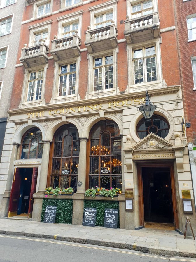 The Counting House is just a few buildings down from St. Michael’s on Cornhill. It is a modern pub opened in 1998. While Dickens pilgrims would like to think that the name was chosen to associate with Scrooge, the fact that the building is a former bank is more likely. Additionally, the pub doesn’t seem to make any effort to exploit a Dickens’ link; though I am sure the pub is happy when it draws literary tourists who assume there is.