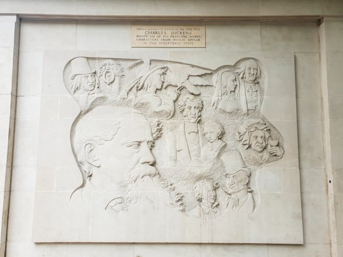 Just around the corner and down Marylebone Road a few blocks from the Sherlock Holmes museum is this Dickens Memorial marking the location of a former Dickens home, 1 Devonshire Terrace. It is a mural representing characters from some of the famous works written in this home. I am only sure of the two above Dickens head: Scrooge and the Marley door knocker and Barnaby Rudge with his raven Grip. For sure, David Copperfield would be one of the two pairs directly to the right of Dickens’ face. Drop me a comment if you figure them out!