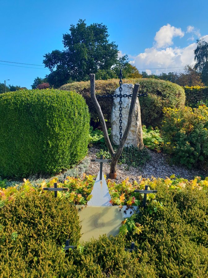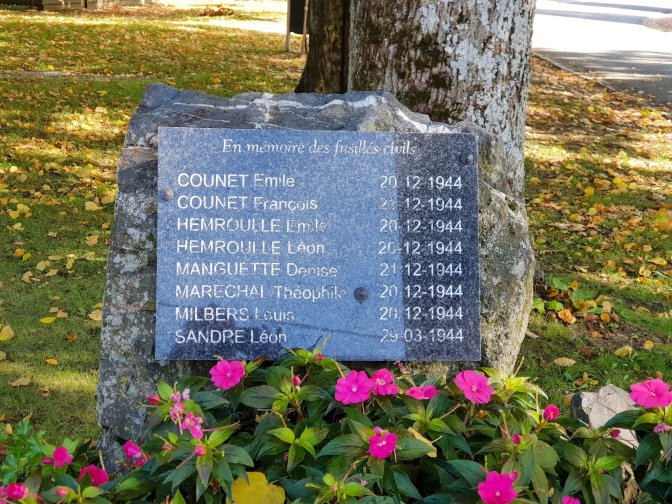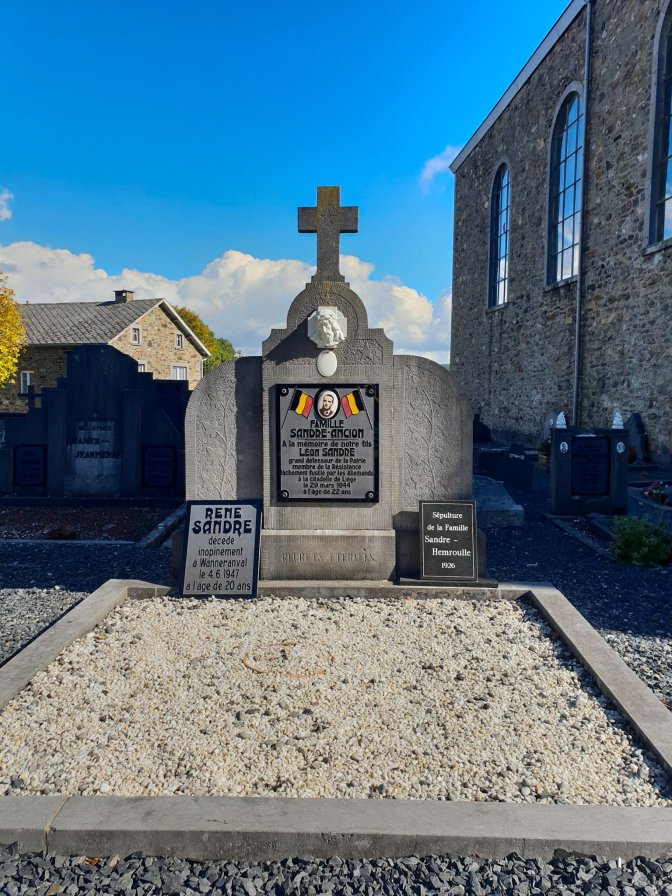 The list of names on this plaque were murdered by the Germans for either being accused of giving away their positions1 or just being in the path of blind vengeance. Denise Manguette was shot as she was trying to cross the street to find a better hiding place1. Leon Sandre is the exception here as he was a member of the Belgian Resistance who was executed later on. He is buried in the family grave next to the church in Wanne (see below).