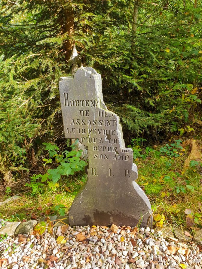 After Wanne, the hike follows along a farm path between open fields and apple trees until coming to a forest where a hidden memorial exists with a sign marker reading “La Croix du Crime”. The memorial stone is broken but refers to the murder or assassination of someone named Hortense. I could not find any information about this.