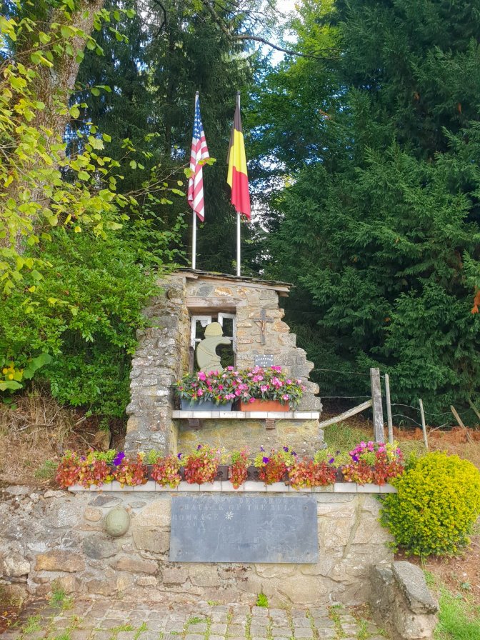This was a beautiful and peaceful hike on a sunny early Autumn day. The little towns feel out-of-time, like model villages whose structures only exist to give the appearance of population. Passing a living soul imbues a flurry of curiosity. Who lives here? What stories did the grandparents and great-grandparents pass down? Every family that was fortunate enough to survive or return here after evacuating must have many haunting tales. It is not difficult to imagine nervous paratroopers going from house to house, poking rifles into haystacks, and hiding behind old stone walls. Or confronting a terrified villager pleading indecipherably in French. Soldiers coming from cities and towns all over the United States, suddenly thrust into this idyllic place fighting for their lives. It is hard to imagine, though, that this elegant, serene area was a war zone on multiple occasions, and a place where for many months after the battle, hiking would have been a deadly risk due to landmines. Today, these few plaques and flags hold their sentinel-like positions along lonely roads and in lonely corners of barely-existing collections of houses, curiosities in a world which has passed them by. As I strolled through each village, I also couldn’t help imagining that somewhere in the world could be a gray-haired withered woman holding a black and white photograph, shaking in her arthritic hand. A soldier in uniform — her father — who went off to fight in Belgium and never came home. He died in some place called Logbierme or Rochelinval or Wanne. Someplace she probably can’t even pronounce. And when she passes on, whatever we weren’t supposed to forget becomes more forgotten. Meanwhile, some hiker like me in the present day stops to take a photo of a memorial, reflects for a moment, and moves on. Thoughts which barely register in the universe. Like briefly glancing at the scenery and returning one’s gaze squarely back to the ground in front of you. We spend too much time missing the copious beauty around us. We should never forget, never forget the things that have made us happiest in life. Life is fleeting. What these memorials help me to not forget even more than heroism, tragedy, or patriotism… is that.