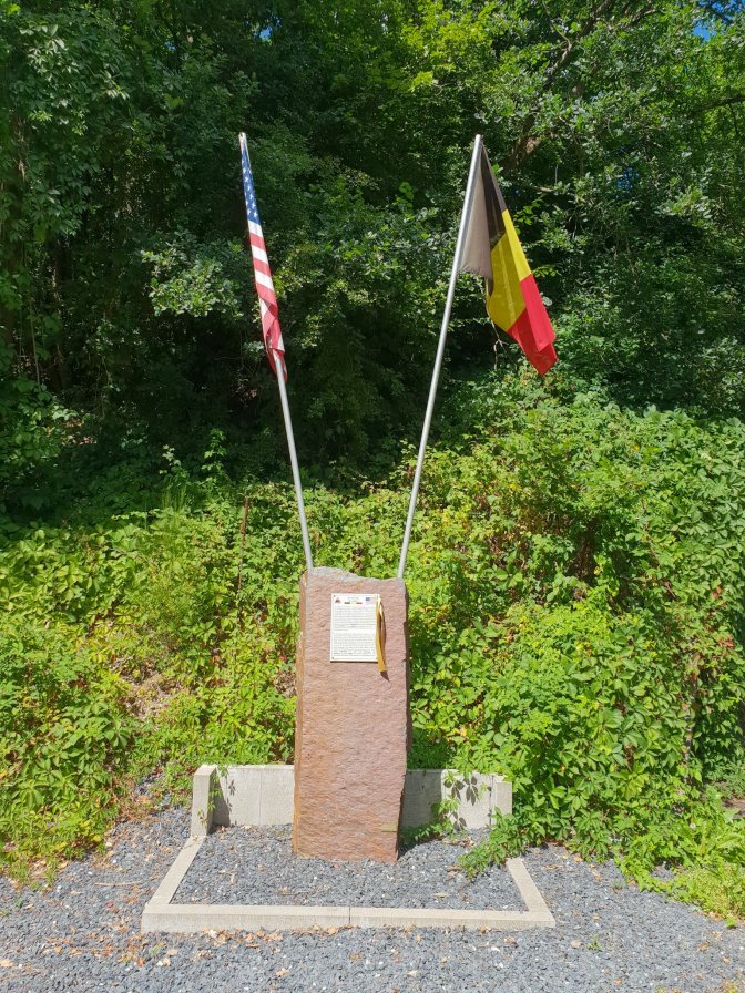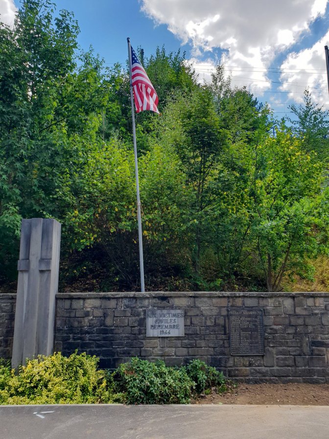 After Petit-Spay, I walked back to Trois-Ponts by the main road, in historical context called the road to Trois-Ponts from Stavelot and Malmedy. This is not a pleasant road to walk along as cars are bursting from the speed limit constraints of Trois-Ponts and accelerating back to joy ride speed. In December 1944, this road would have been infinitely worse; lined with refugees from eastern Belgium trying to stay ahead of the German lines or by the ruthless Kampfgruppe Peiper and their advance. At the eastern entrance to the city are memorials to both the American military and the Belgian civilian victims.