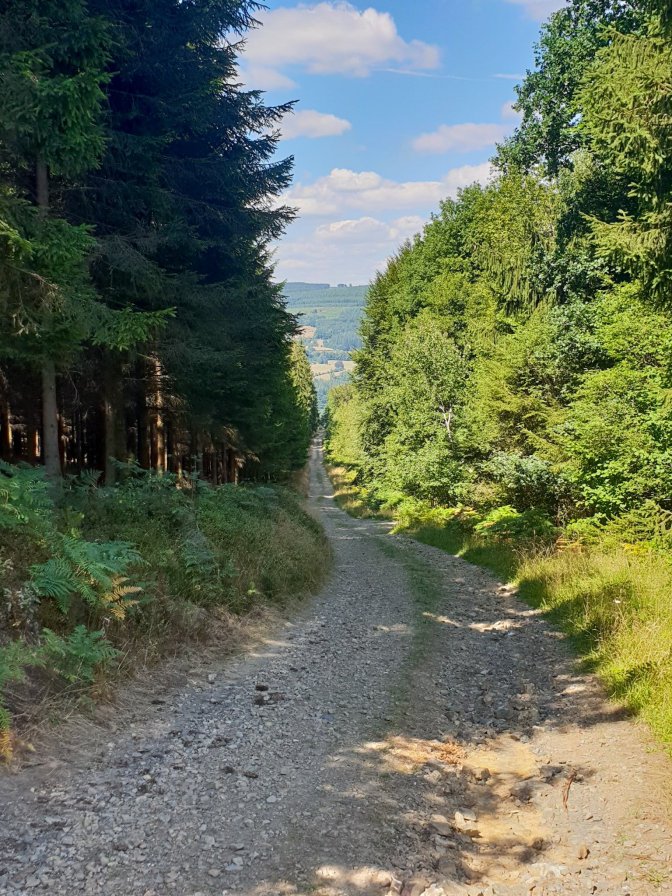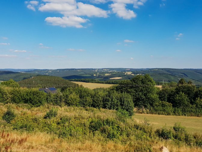 The hike heads upward with a grand view looking back over Trois Pont. The Salm River valley is in the center and the forest where Petit Spay is located is in the hill on the distant left.