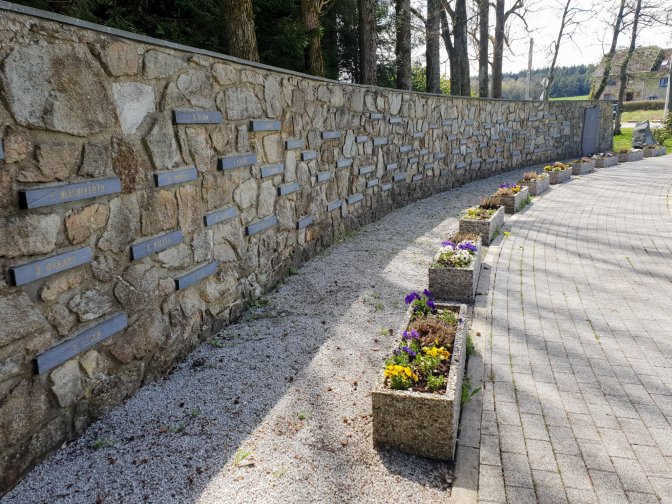 On the north-side of the cathedral, a path which leads to the Malmedy cemetary where there is the memorial to the civilian casualties.