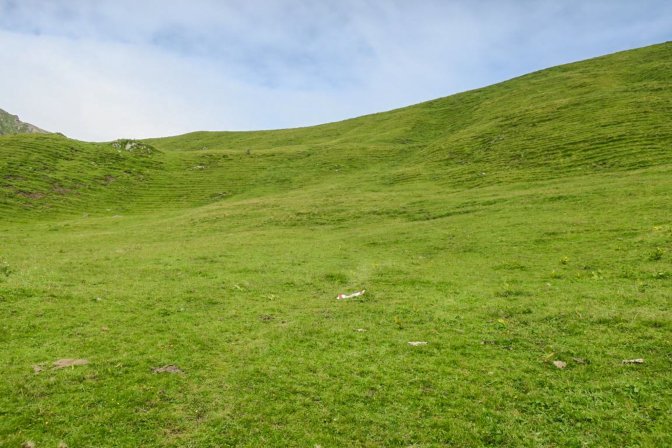 To get up to the ridge, it is necessary to climb up the grass. There is actually a path here. It is more or less visible, but just in case, keep your eye out for the red/white paint. Worst case, it is just grass so you can brute force it.