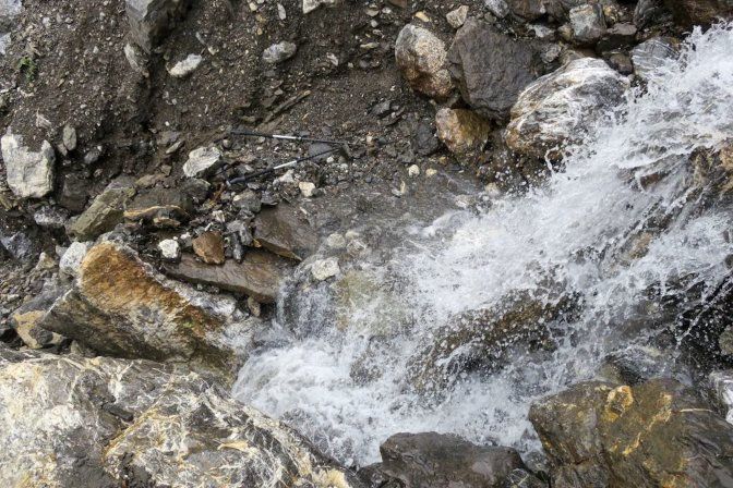 At this point in the hike, it was necessary to get across this section of water. A short but fast moving waterfall. It was on a steep decline and did not have an obvious way across except directly across. This, however, is sure to get your shoes and legs wet. Not dangerous, but it ended the use of the particular pair of shoes I was wearing for the rest of the trip.