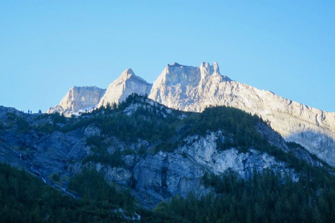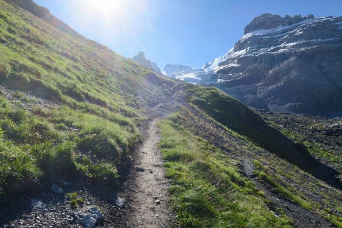 Back in Belgium, the sun would already be coating the earth with a bright, soft promising radiance. Instead, the Alps around Kandersteg, Switzerland kept everything in shadow, still caught between night and day. The lower mountains in their bluish haze slept in while the tallest snowcapped peaks looked down like grey-haired grandparents who always wake at the crack of dawn. I left my hotel and headed for the trail; my brain high on anticipation, euphoric that today was the day. The Gspaltenhornhütte hike had its challenges, but this… THIS was the hike during Bernese Oberland Season 7 that would test my limits. This was the hike that would define the week in the perpetuity of my soul.