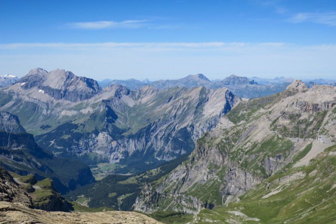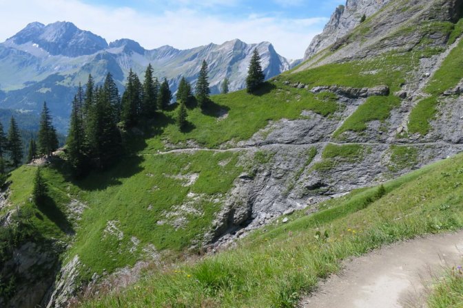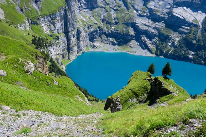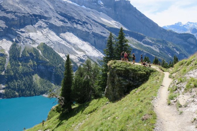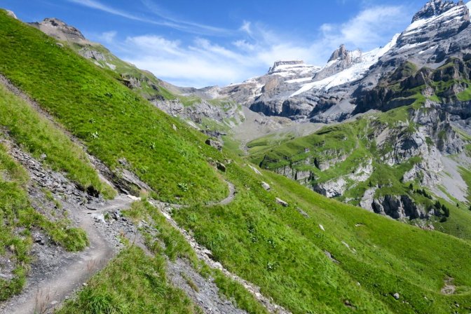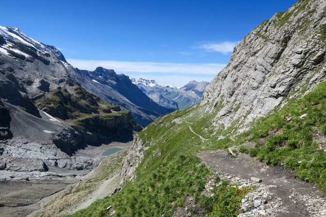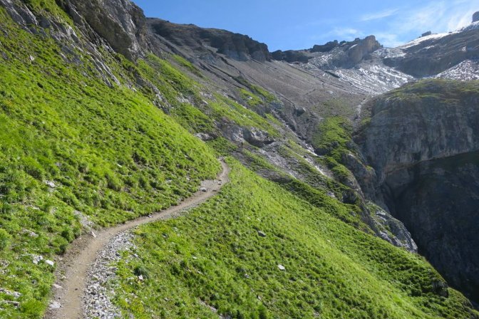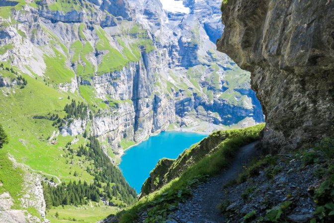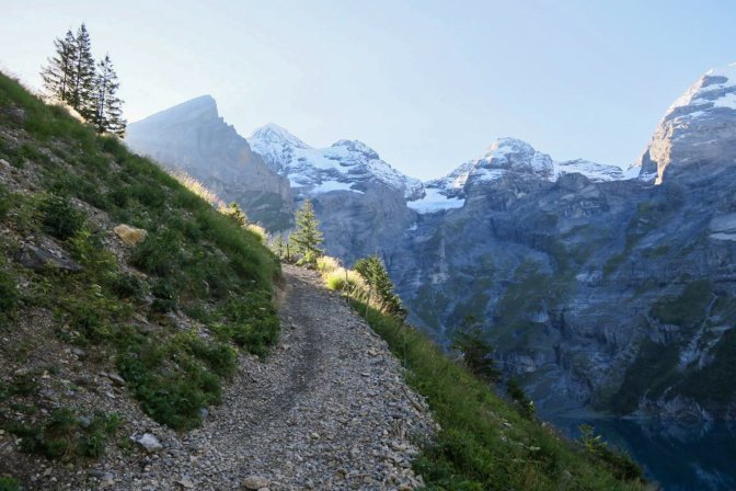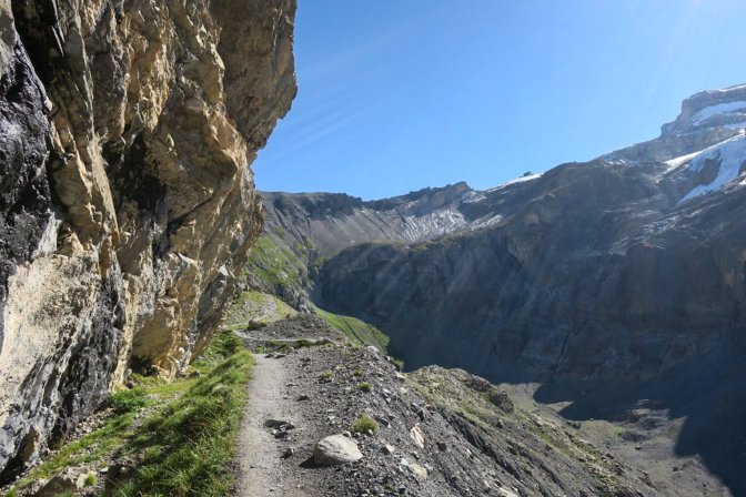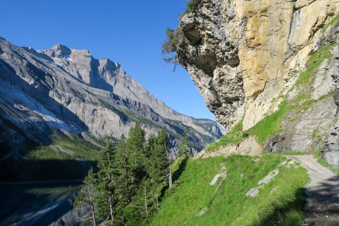 The first half of this is a long slow uphill trudge of astounding beauty. I created part of the hike as a loop by following the Oeschinensee on the way up and then taking the high path on the way back. There is an opportunity to cut out the first and last 3km if you decide to take the Oeschinensee cable car up and down. The fear of heights factor for me was pretty low. There were no problem spots on this hike. No special equipment is needed.