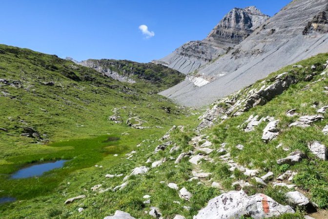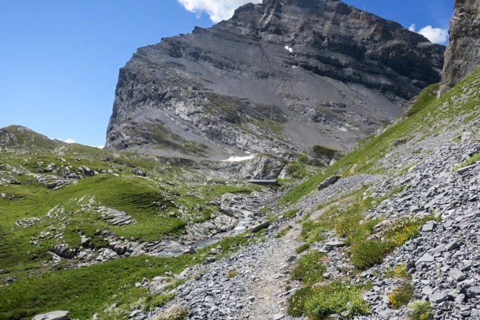 Here I am approaching the farthest point of the hike where it turns right to head into the mountains towards Lämmerenhütte. This would add another 8 km to the hike so I proposed to make this a goal for the next season. Instead I went left towards Gemmipass.