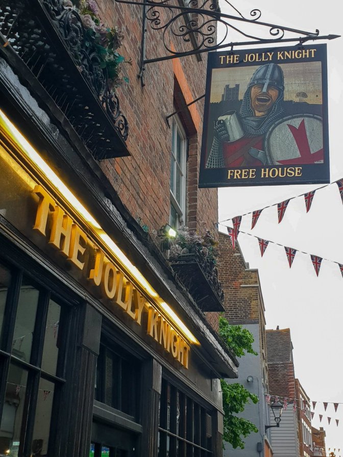 Connected to The Jolly Knight by a common restroom area, Ye Arrow also doesn’t ooze with medieval charm inside, but it has a wonderful terrace facing the castle and cathedral. This alone makes it a must stop. I enjoyed a Calendonian House Ale by the Caledonian House Brewery in Scotland. and tried to catch up on my reading.