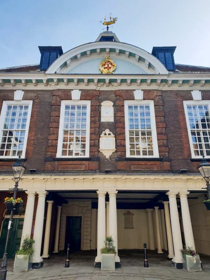 In The Seven Poor Travellers, Dickens writes “The silent High Street of Rochester is full of gables with old beams and timbers carved into strange faces. It is oddly garnished with a queer old clock that projects over the pavement out of a grave, red-brick building, as if Time carried on business and hung out this sign.”