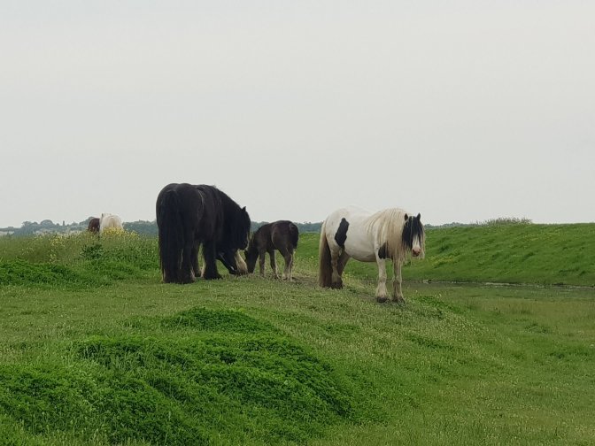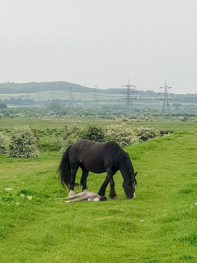 There are animals grazing in the marshes, both cows and horses. I came across this small herd of horses where a foal was lying so still on the ground, I couldn’t tell if it was alive. Walking close to it made me a bit nervous with the mother nearby munching grass, but she didn’t pay me any mind. I kept looking for signs as I was pretty sure the foal was only sleeping. Eventually, my patience was rewarded.