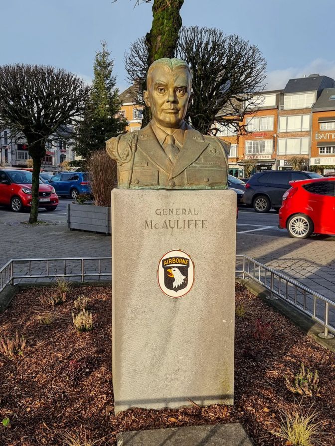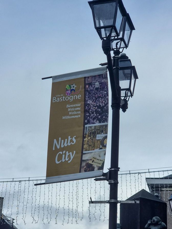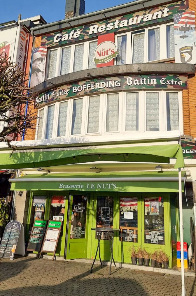 Today, Bastogne welcomes you to Nuts City. The main square, which is a parking lot surrounded by restaurants and a charcuterie, is called McAuliffe Square and is guarded by a bust of the General and a Sherman tank. Flanking the square is the aptly named Brasserie Le Nuts.
