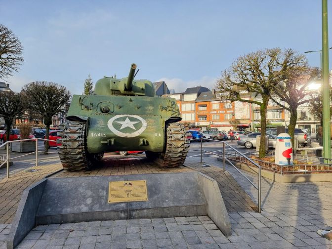 Follow along Bastogne’s enjoyable shopping street. At the end just past the church is the second of three Liberty Road markers.