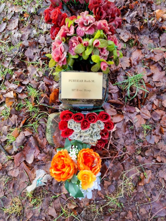The two most decorated memorial stones belong to Ruth Puryear who was First Lieutenant and nurse of the 107th Evacuation Hospital. She was also part of the liberators of Buchenwald concentration camp. The other is Lt. Col. Everett “Red” Andrews who gives his story in the short clip.