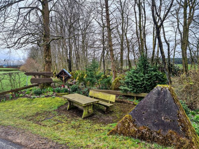 A drizzling rain started to fall as I arrived to the far point of this hike, the Hollerather Knie (or Hollerath Knee). The Hollerather Knie was the site of several bunkers, which have been destroyed and absorbed into the surrounding farmland. It symbolically memorializes the starting point of the Battle of the Bulge. From here, the Sixth Panzer Army headed into the direction of Krinkelt, Rocherath and the Elsenborn Ridge (foreshadowing my next hike).