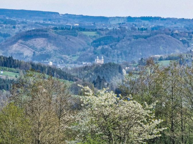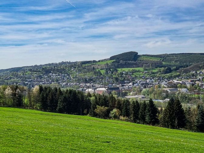 Near the end of the hike as I started to come down the fateful hill traversed by Kampfgruppe Peiper, a view of Stavelot appeared.