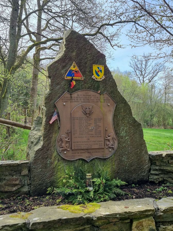 On the spot of this stone were found twelve executed soldiers and three civilians who were murdered on December 17. One of the emblems above the plaque mentions Remagen, which was the German town with the bridge over the Rhine river secured in March 1946 by the same battalion.