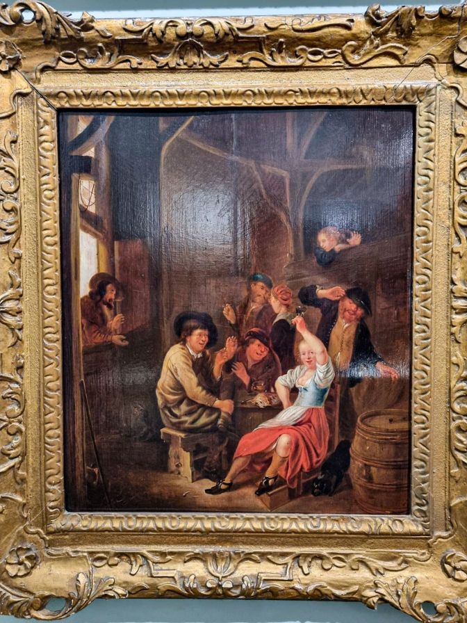 The museum had one qualifying painting; a 17th century tavern scene from an unknown artist believed to be from the workshop of Adriaen van Ostade from Haarlem, Netherlands. Here we see a brightly lit woman raising her Berkemeyer glass and singing as the guy in the window is clapping his hands. Interestingly, the woman is the only one in this scene who has a drink. Which made me realize that I also didn’t have one. Time to go visit some pubs.