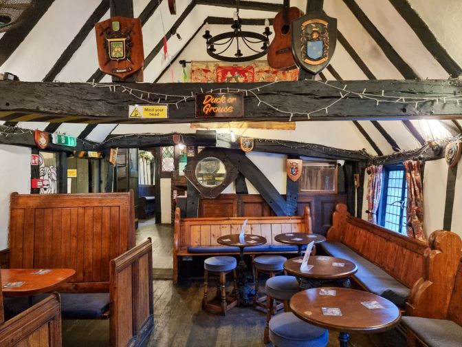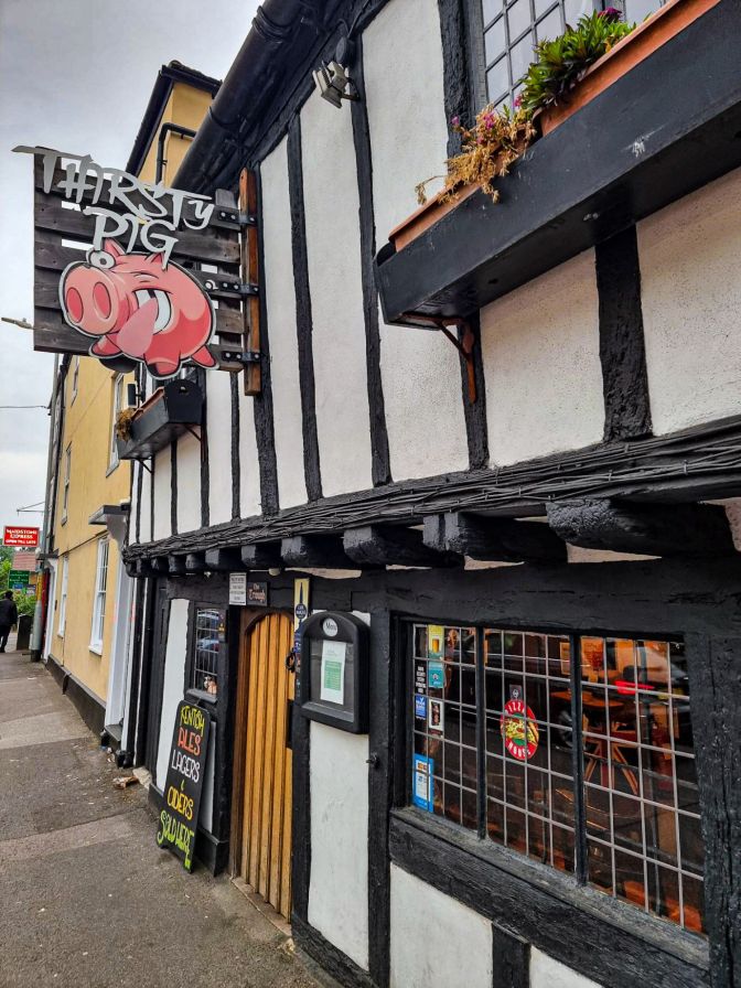 Easily gets my vote for the most attractive pub on the list with its half-timber exterior, walls with no ninety-degree angles and oak-beamed sailing ship-like interior. For good measure, there is the low-hanging entrance which will surely give you a friendly pat on the noggin on the way out. I find the sign, however, to not quite fit the medieval aesthetic, especially without the “Ye Olde”. It is here where I got asked the question Glass or Mug? for the first time on the trip. Remembering back to my experience at The Thomas Becket pub in Canterbury a year earlier, I knew the correct answer this time. The traditional glass for a bitter is not the ordinary flat glass that you see in my other photos, but a dimpled mug.