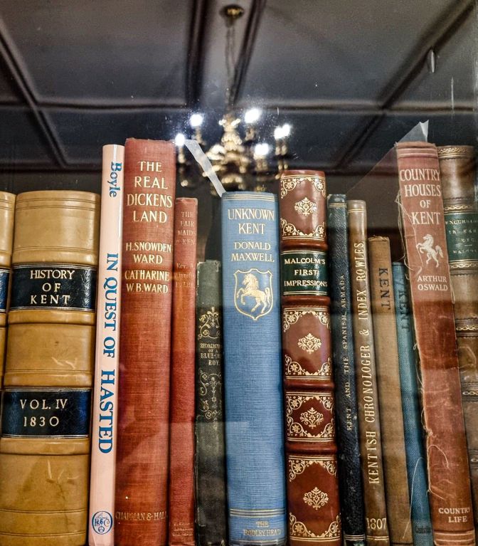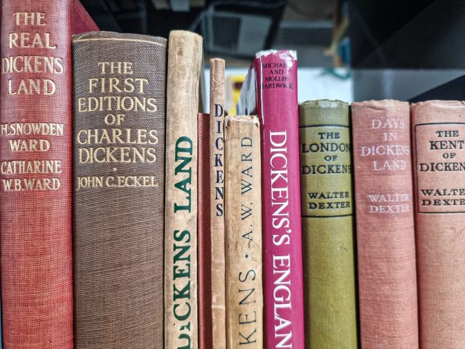I looked for this “Dickens-item” unsuccessfully, but in retrospect, I find that I misinterpreted the above passage and was looking for a bust when now it is clear to me that it is a wood carving. So, I cannot verify if it still exists or not. However, not all was lost. There is one room with a nice collection of old books, and I spotted one that I also own, The Real Dickens Land by H. Snowdon Ward and Catherine Ward.
