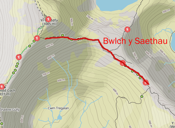 The route is generally not dangerous, but when you reach the pass known as Bwlch y Saethau marked in red, it was quite intimidating on this day. There was very little visibility and the torrential winds were making the trek unnerving. Under these conditions, the trail was sometimes difficult to find. However, the GPS signal on my mobile phone was keeping me well within the vicinity of the path when I would occasionally stray off. Even in Summer, bring a warm hat, gloves, and wear layers.