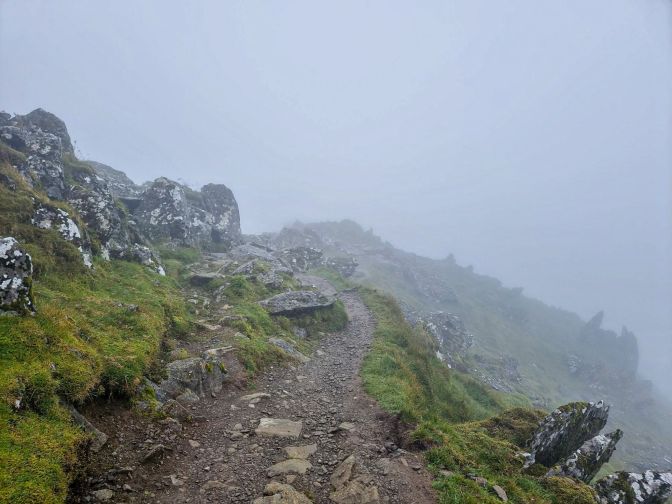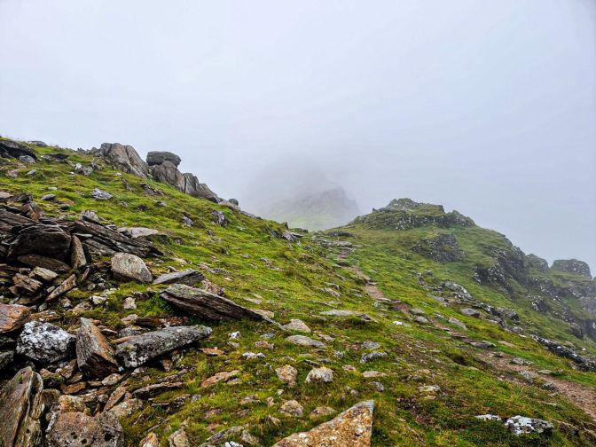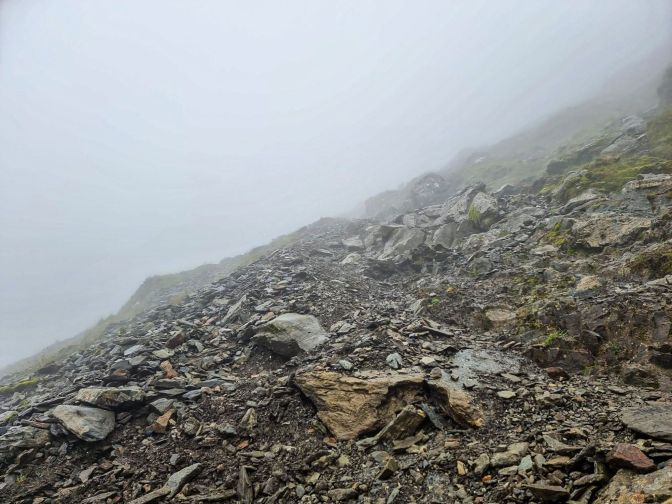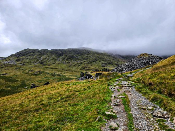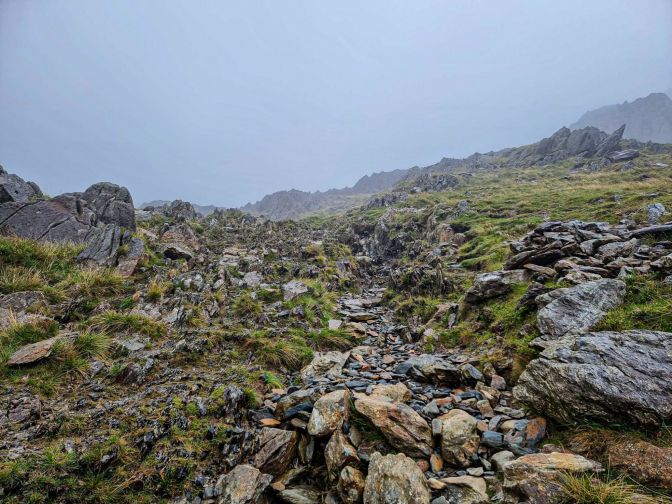 The further back you go, the more rugged it looks. Mounds of scree remind you that this land is not untouched. It was once home to some very hard-living Welsh miners. The low-hanging clouds gave little hope of having any visibility at the Yr Wyddfa summit.