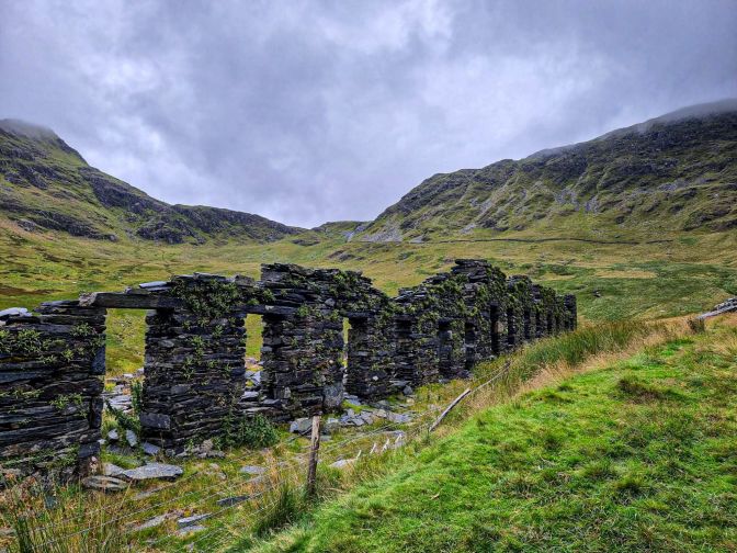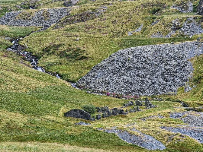 From the parking lot, you will follow a road which leads to the glen called Cwn-y-Llan. This route heads deep into copper mining land. The remains of huts and buildings dot the landscape.
