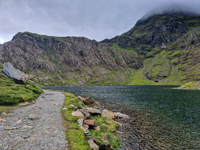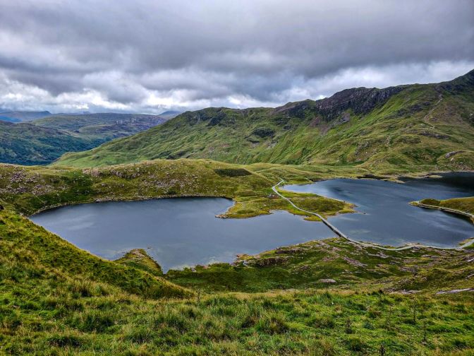 At the highest of the lakes, Llyn Glaslyn, the Miner’s Track converges with the PyG Track. From above, the water of Llyn Glaslyn has a dark turquoise almost obsidian-like quality. The ridge around the lake forms part of the Snowdon Horseshoe. That is not part of this hike.