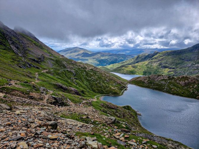 The view above Llyn Glaslyn gives a great look at where the two tracks meet. The Miner’s Track heads down to the lake.