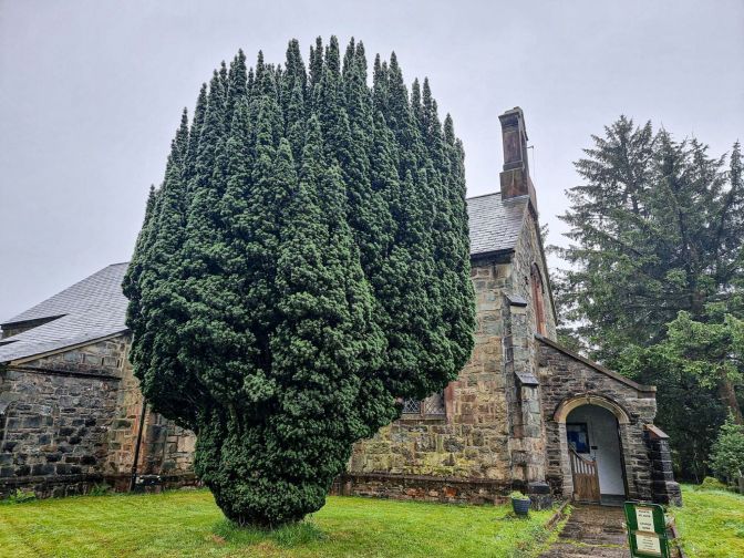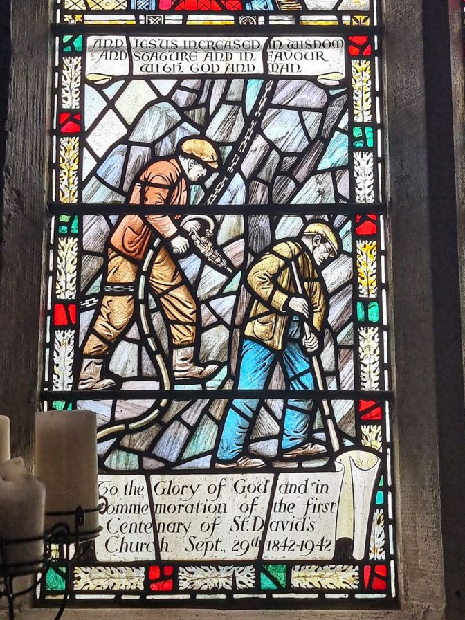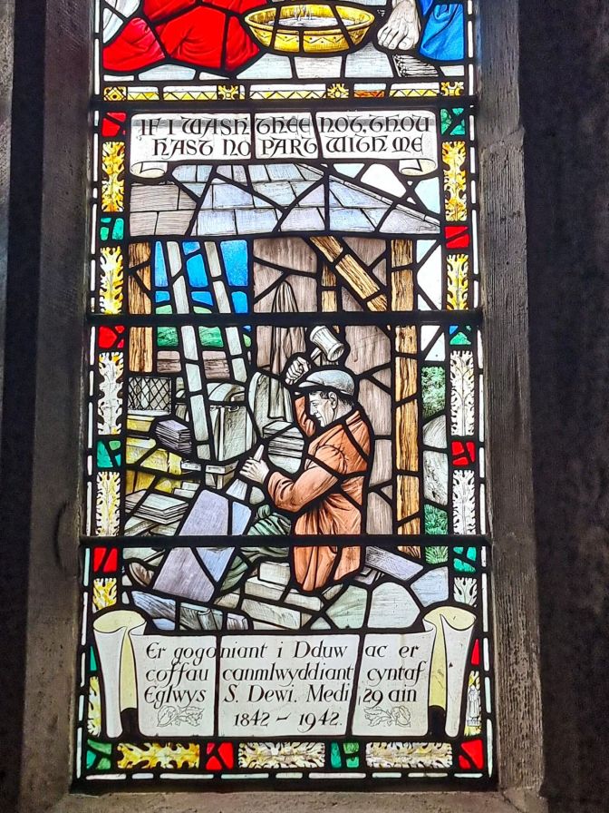 It was befitting on the morning of the train ride that the skies were as gray as slate. This did not bode well for the scenic part of a scenic train ride. But I could not have anticipated that Blaenau Ffestiniog was even grayer. It was every bit the word “drab” in the quote above. High Street on a Saturday morning was practically listless… other than a supermarket and one lonely gift shop (Siop y Gloddfa). While waiting for the train, I stopped into the small St. David’s Church which has stained glass memorializing the town’s slate-mining past.