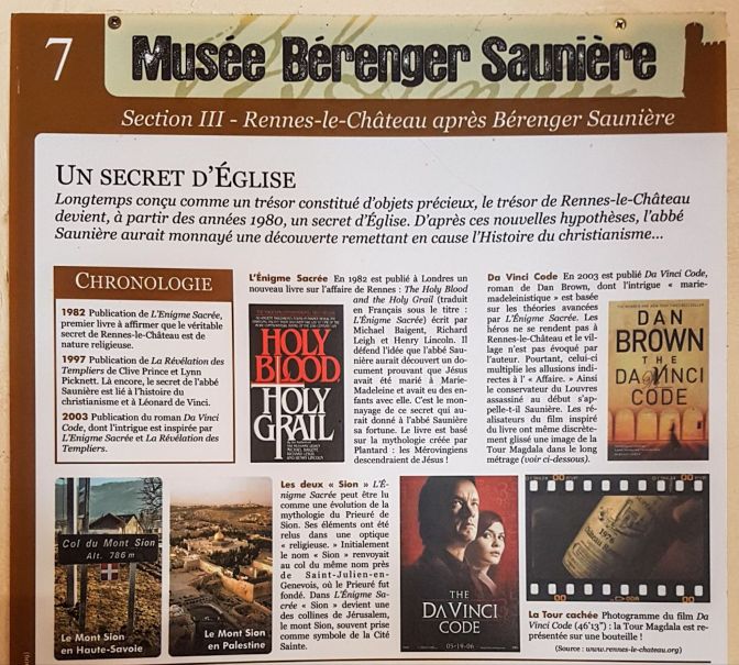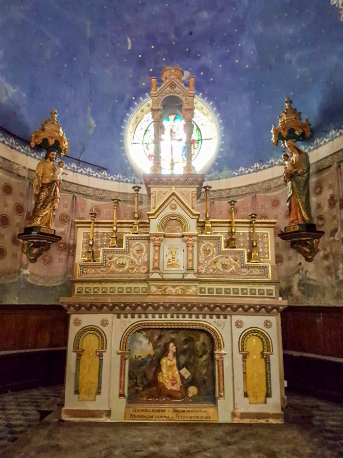Is there a village on Earth which has benefited more from a hoax? You all know the story. The hoax centers around a local priest Bérenger Saunière who in 1891 suddenly goes from being a holy man in a destitute village to a priest with incredible wealth. The story according to Holy Blood Holy Grail and subsequently the Da Vinci Code is that Sauniere discovered some secret documents hidden in a pillar in 1891 which proved that the Catholic Church had covered up the bloodline of Christ through his child with Mary Magdalene. It also revealed a secret society called the Priory of Sion, who were sworn to protect the secret. Leonardo Da Vinci, of course, was one of the supposed grandmasters, hence the book title. Saunière then acquired his riches through hush money from the Pope. Another theory had Saunière discovering a parchment which led to the discovery of a large horde of Cathar treasure. In reality, Saunière was selling Catholic masses by mail order. In other words, he was the 1891 version of Amazon.com for Catholic mass. He did use the money to uplift Rennes-le-Château from a rundown backwater into a more elegant backwater. Saunière gave the church a complete makeover, but it was his eclectic choice of decor which has helped fuel the conspiracy theories that would follow after his death in 1917. Anything out of the ordinary in the decorations became a clue to the buried treasure some fifty years later when opportunistic charlatans and pseudo-historians raised Rennes-le-Château into the realm of the Loch Ness Monster, Bigfoot, and the Bermuda Triangle. They did such a fantastic job at it that I couldn’t have been more excited when I saw the city name on a sign along the road to the village.