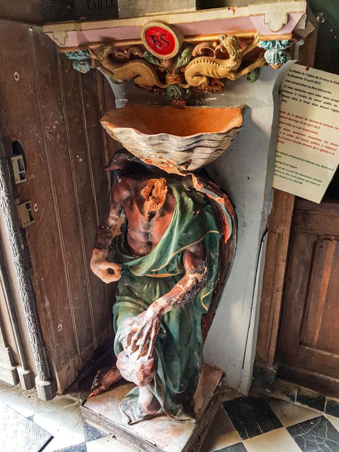 Entering the church for the first time, I was utterly disappointed to find the infamous demon Asmodeus carving under the holy water font had its head removed for repairs due to vandalism. This head was already a replacement as the original had been stolen many years ago.