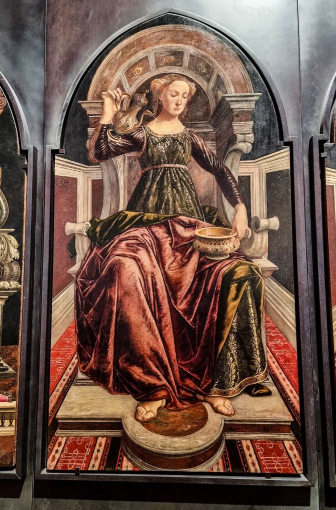 It doesn’t take long in the Uffizi Gallery before our enthusiasm is put to the test. In this 1470 work called Temperance, we see a woman pouring hot water out of a vessel into a bowl of cold water to represent moderation. Or it could be the other way around. Maybe we are the hot water in the bowl and she is pouring cold water on us. Either way, it’s not wine. And she certainly has the look of a woman you don’t want to cross.