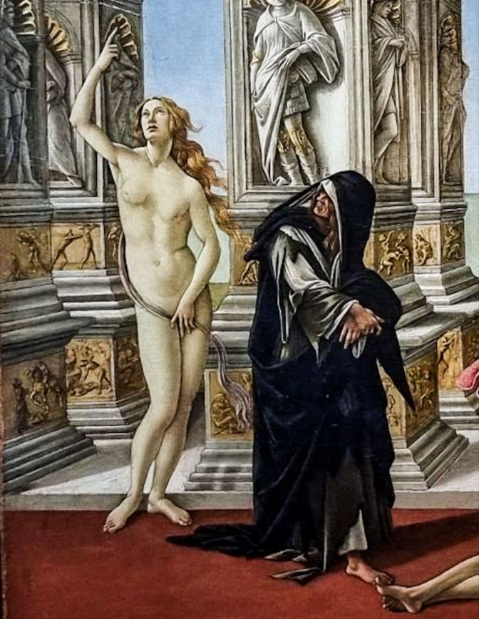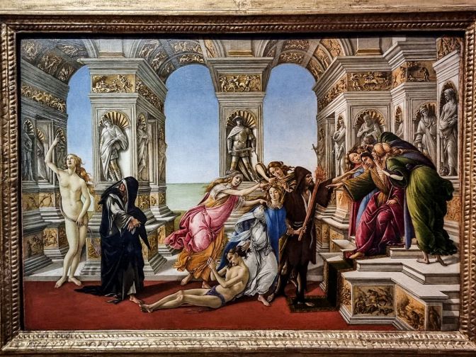 A little further on, this Botticelli scene full of writhing figures must be some alcohol-induced moment of debauchery which I could gleefully write about, correct? Wrong. In this scene, Calumny is dragging Slander before King Midas. Fraud, Deception, and Spite join Calumny while Suspicion and Ignorance whisper in the King’s ear. What are we to make out of all of this? Zooming in on the left side of the panel, one finds Repentance covered in a black robe looking back at the Naked Truth. I certainly was not being inspired to feel less guilty about all of the beers I would indulge in later. Another interpretation is that Repentance is ignoring the injustice that was taking place right in front of her to gaze back at the naked figure. Could this say something about the vanity of social media? I was soon to find out.