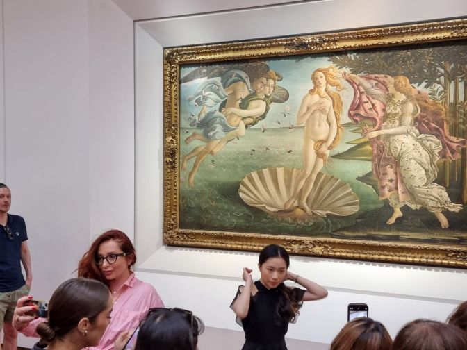 Here we have two flies caught in the trap of Botticelli’s Birth of Venus, perhaps the most famous painting in the entire Uffizi collection. Does not Venus look similar to the Naked Truth in our previous entry? One of the young ladies posing is interestingly dressed in black but the other one spoils the poignancy by wearing pink. Both are assuredly not paying attention to the evils of injustice, such as blocking everyone’s chance to get a good photograph of the painting. Furthermore, neither lass can agree on which side of the head Venus’s hair is falling. Savonarola would have a sh*t fit at the entire spectacle.