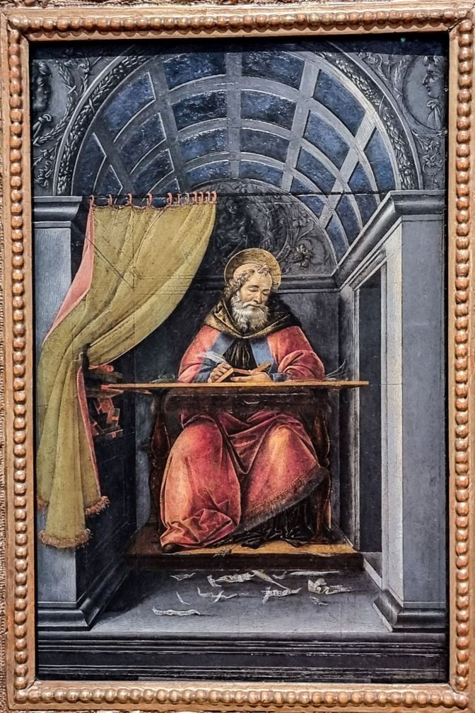 Alas, a theme was as elusive as a broken piece of egg shell in a bowl of yoke. I soon came upon another Botticelli called St. Augustine in His Study who is sitting at his desk writing under the vaulted ceiling of what looks like a very fancy shower stall. At his feet are the scraps of paper containing all of his rejected thoughts. I looked upon his solemn gaze, clearly confounded in his own mind what to put down in his journal, as a kindred soul. It was going to be a long, arduous journey through the Uffizi. One thing was clear. I needed to get away from Botticelli.