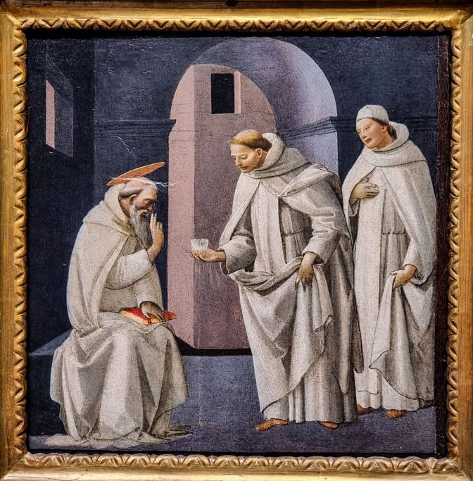 In the Uffizi, it is important to take advantage of any painting with the word wine in the title. This one, however, comes with an asterisk. Here, two monks offer a glass of poisoned wine trying to lure the domineering St. Benedict into unwittingly choosing a frothing, choking, and undoubtedly painful death. St. Benedict’s menacing hand gesture could represent the fraction of a second before he put a bullet into their heads or maybe he was about to poke the first one in the eyes like Moe of the Three Stooges. Either way, St. Benedict survived this encounter.