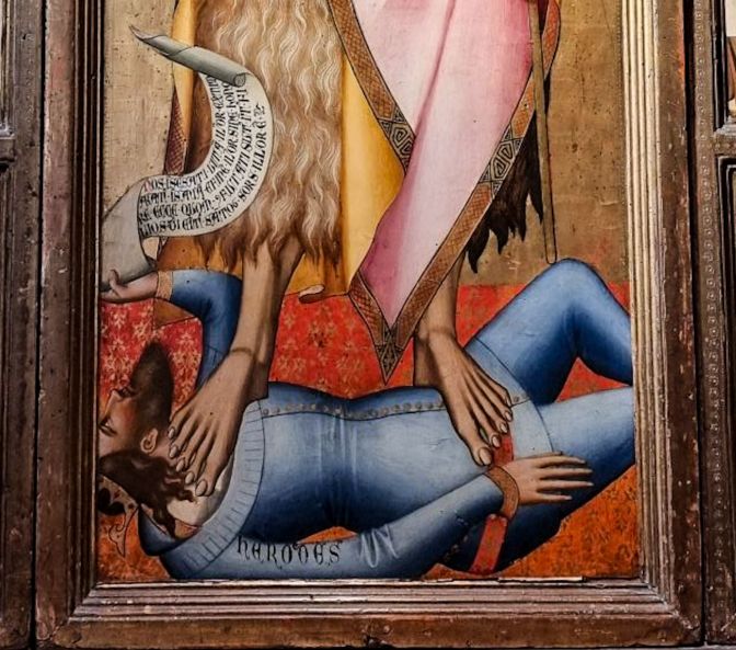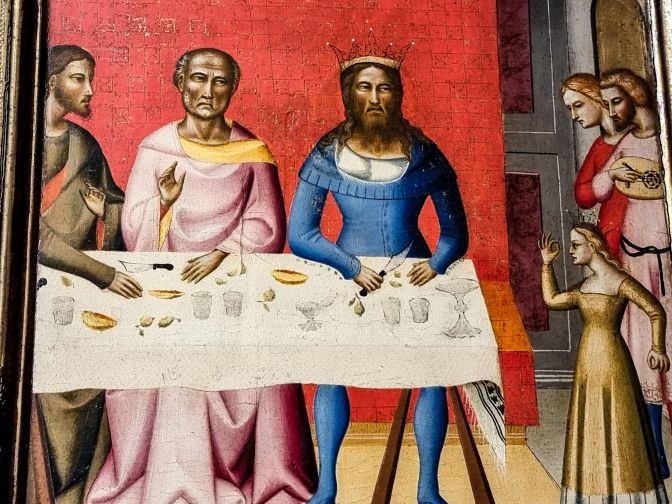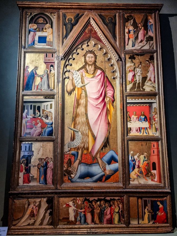 The next painting is the first which falls out of the timeline. This was painted almost 100 years before Savonarola. Here, Del Biondo produced an altarpiece about the life of John the Baptist. Of most interest to me was a panel on the right showing the feast of Herod, the Roman King of Judea who would order all babies aged two or younger to be killed around the time of the birth of Jesus. Herod looks in a rather foul temperament gripping a knife as he sits before an empty wine flask and several empty glasses. Nothing could be worse than listening to the tormented wails of hundreds of devastated mothers while completely sober. The Renaissance, especially under the Savonarola reign, would continue this theme of sobriety. But it does not save villains like King Herod from receiving their comeuppance.