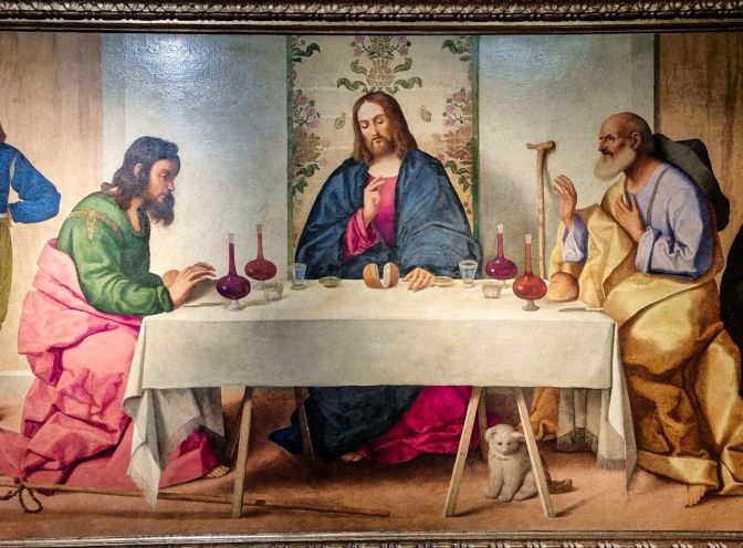 In 1498, Savonarola was tried, hanged, and burned. His ashes were spread over the Arno River. Following his death, perhaps artists felt a little more free to express themselves. Here we actually see four very pretty decanters full of wine. That’s a good start! Yet not a single glass has wine in it. The young disciple on the left, looking like a Jeopardy contestant, clearly can’t wait for Christ to finish praying, his hand ready to grab a flask the second he hears the word Amen. Meanwhile old Cleopas sits across the table gesturing for his young companion to take it easy, man. Temperance is starting to crack but it’s still intact.